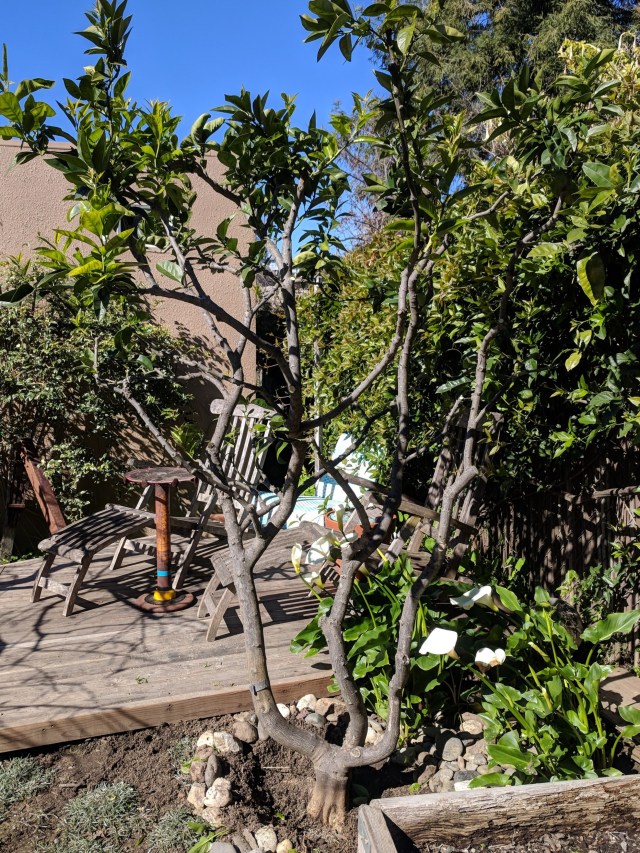 It’s not always the canopy that needs the most work when doing tree care. With this blood orange tree (Citrus x sinensis) the majority of the work I did was clearing out and pruning the root zone, rather than the canopy. I did remove and reduce some branches that had been pruned improperly in the past to encourage faster healing. (Note: above, notice the difference at the base of the tree.)